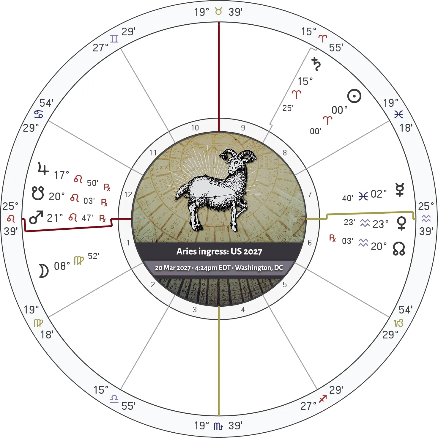 It's also important to note that this issue doesn't resolve neatly with the midterms themselves. The degree at the center of this configuration – 25° Leo – rises on the ascendant of the following year’s Aries ingress, setting the thematic tone for the astrological year that runs from March 2027 through March 2028. By that point, Mars and Jupiter will be retrograding back toward one another in Leo, forming a close conjunction that never quite perfects. Even so, the Aries ingress effectively freezes this image in place: Jupiter at 17° Leo, the South Node at 20° Leo, Mars at 21° Leo, and the ascendant at 25° Leo, all concentrated in the same region that has already been shown to matter repeatedly in the context of executive force and authority.