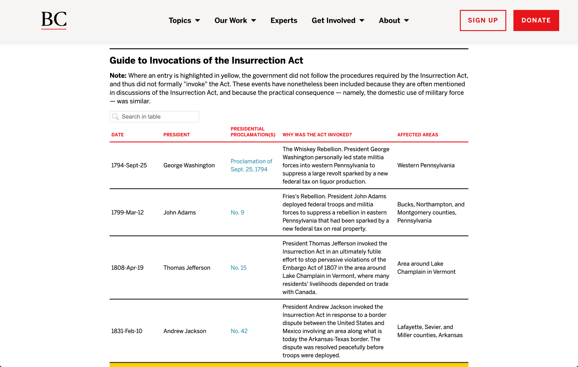 The Brennan Center for Justice has assembled a historical record of instances in which the Insurrection Act, or its statutory predecessors, were invoked either formally or in ways that closely approximated formal invocation. [5]