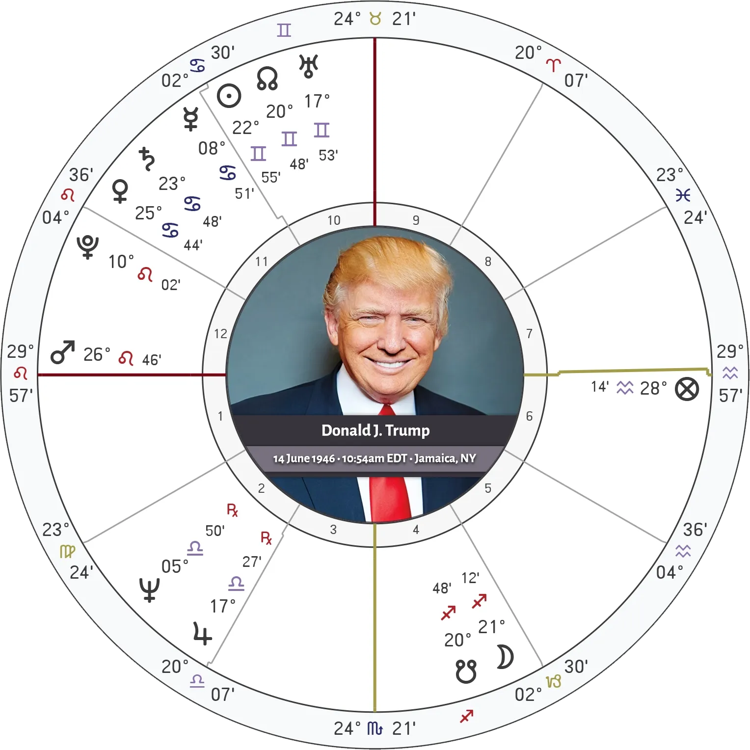 25° Leo closely aligns with Donald Trump’s natal Mars at 26° Leo and his ascendant at 29° Leo, and it also coincides with the midheaven of his administration’s chart (i.e., the 2024 Aries ingress), which had 25° Leo on the midheaven. Symbolically, this brings themes of force, authority, and executive action into direct contact with both the personal and institutional axes of the presidency. A Mars–Jupiter conjunction in Leo already suggests overreach and escalation; the presence of the South Node entwined with that conjunction points to miscalculation, exhaustion of judgment, or the repetition of a dangerous pattern rather than sound and noble action.